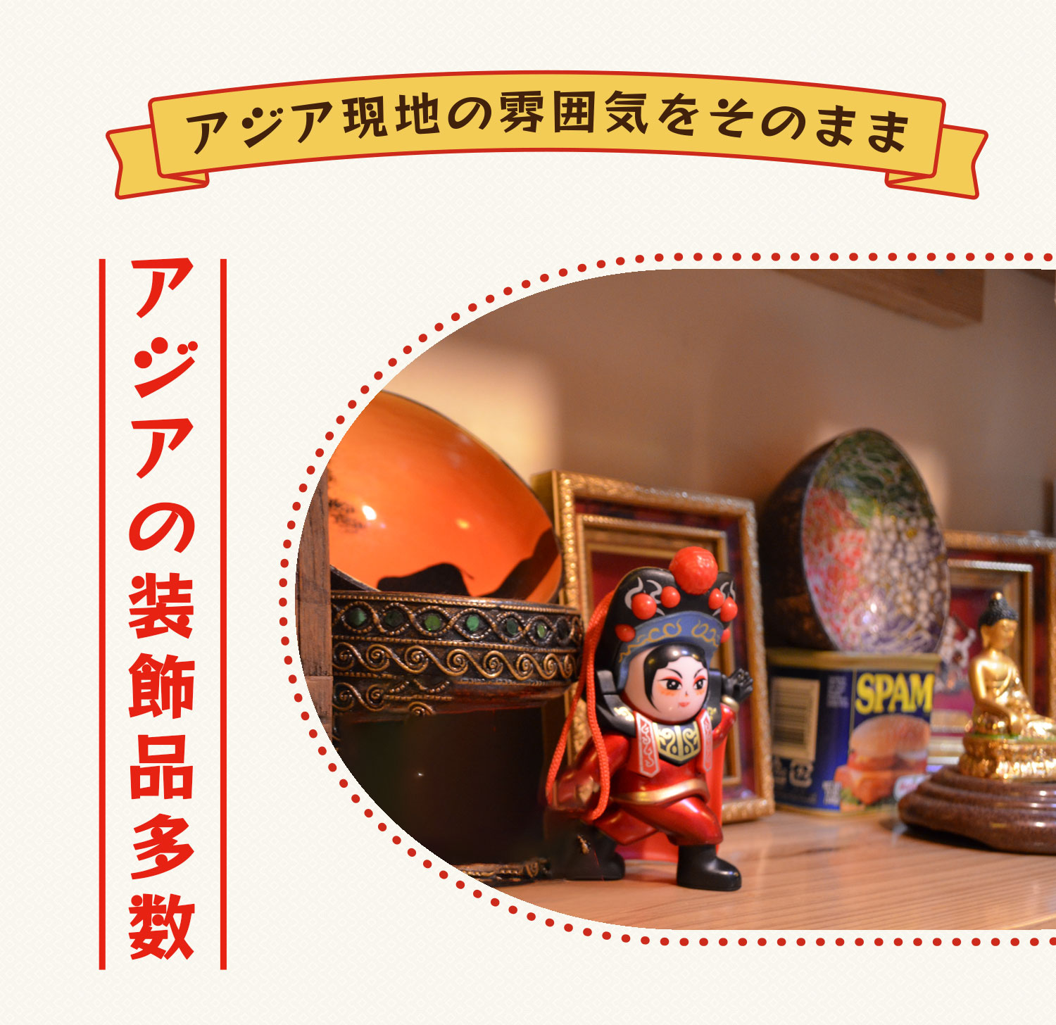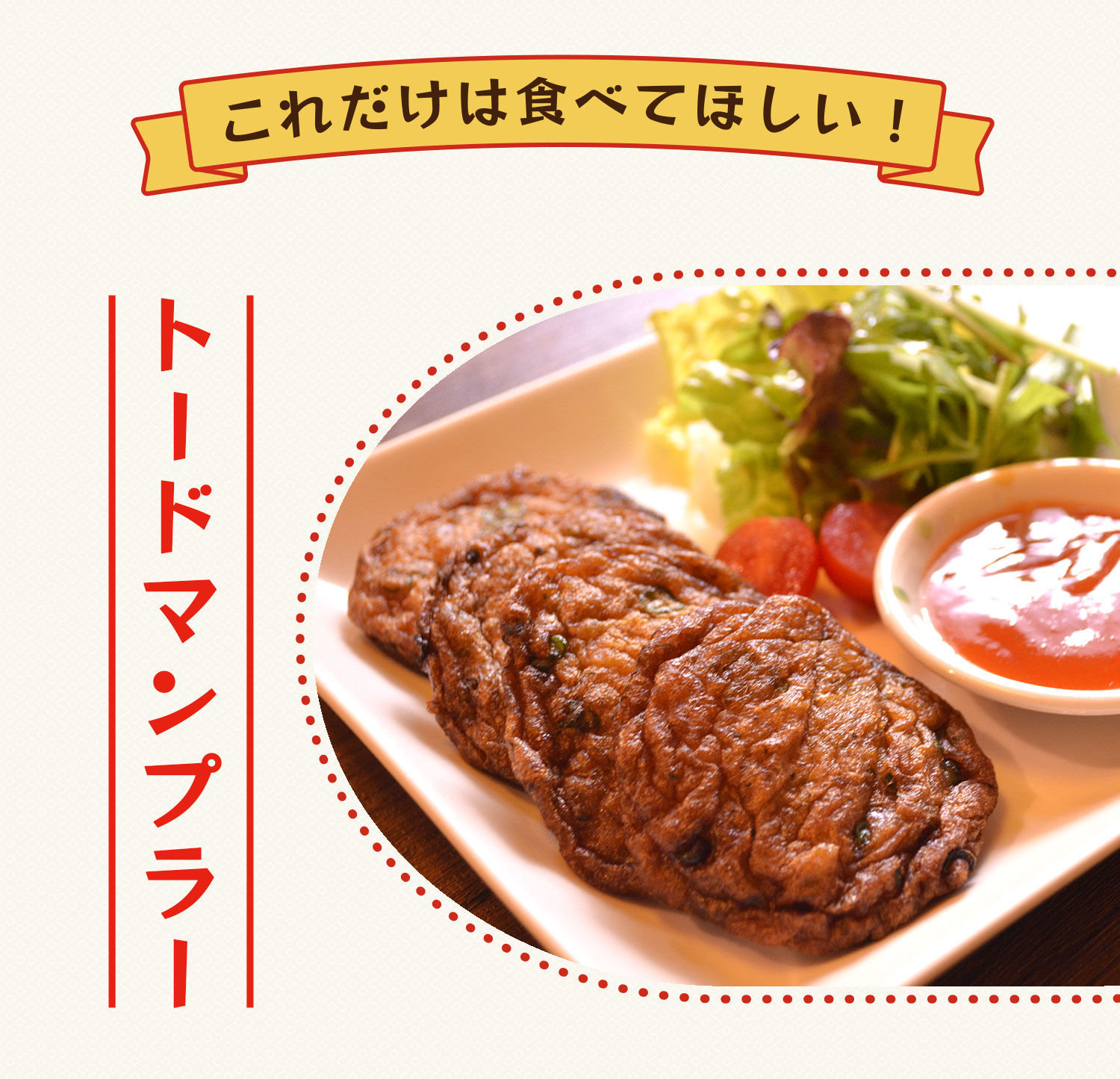 トードマンプラーは、魚の身をすり潰して調味料を加えて仕上げた一品で、タイのさつまあげと言われています。さつまあげと言っても、日本のさつまあげとは違いレッドカレーペーストやコブみかんの葉を加えているので、タイ現地の雰囲気をそのまま味わえるおすすめ料理です。 一度食べるとやみつきの美味しさです! 当店では、タイの現地で使っている調味料を輸入しております。(ナンプラー、ココナッツシュガー、レッドカレーペースト、グリーンカレーペースト、シーズニングソース、オイスターソースなど) そのため、日本にいながらでも、現地の味付けを忠実に再現した料理の数々をお召し上がりいただけます。 普段なかなかご家庭では味わえない本場のタイ料理を、ぜひ当店でお召し上がりください! 店内はアジアの装飾品を多数揃えており、アジア現地の雰囲気をそのまま感じられるお店です。 料理とともに、店内の雰囲気も一緒に楽しめるような装飾品は、店主の個性を感じていただけるでしょう。 ここが日本という現実を忘れさせてくれるようなアジアの雰囲気が詰まった当店で、スタッフ一同皆さまのお越しをお待ちしています! アジアン居酒屋サバイディー 〒900-0014 沖縄県那覇市松尾2-24-6 赤嶺ふとんビル102 TEL 098-917-2870 営業時間 17:30〜23:30 定休日 木曜日 近隣にコインパーキング有り ギャラリー