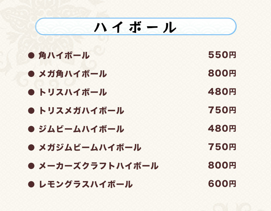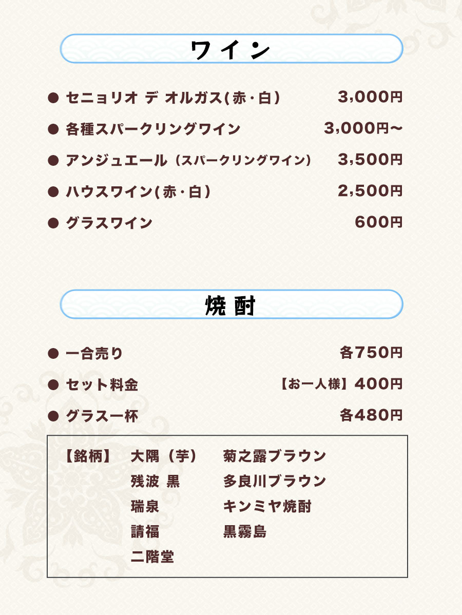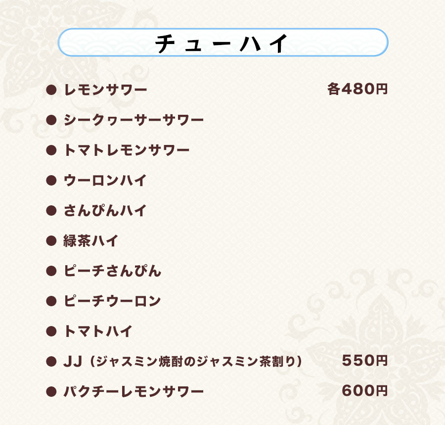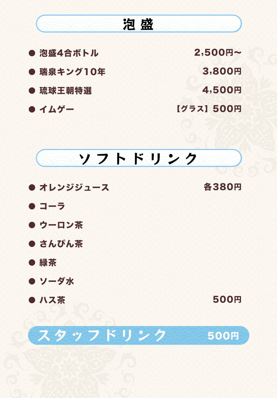 ビール サントリー生ビール ※二杯目以降+100円 ハイボール ジムビーム ハイボール トリスハイボール チューハイ こだわり酒場のレモンサワー梅酒ロック梅酒ソーダウーロンハイさんぴんハイ緑茶ハイピーチさんぴんピーチウーロンピーチオレンジシークヮーサーサワーガシスソーダガシスウーロン泡盛ソーダトマトハイレッドアイトマトレモンサワー 焼酎・泡盛 大隅 (芋)残波 黒瑞泉請福菊乃霧ブラウン多良川ブラウンキンミヤ焼酎黒霧島二階堂琉球王朝 その他アルコール タコハイ翠ジンソーダ ソフトドリンク オレンジジュースコカ・コーラウーロン茶さんぴん茶緑茶ソーダ水 アジアン居酒屋サバイディー 〒900-0014 沖縄県那覇市松尾2-24-6 赤嶺ふとんビル102 TEL 098-917-2870 営業時間 17:30〜23:30 定休日 木曜日 近隣にコインパーキング有り ギャラリー
